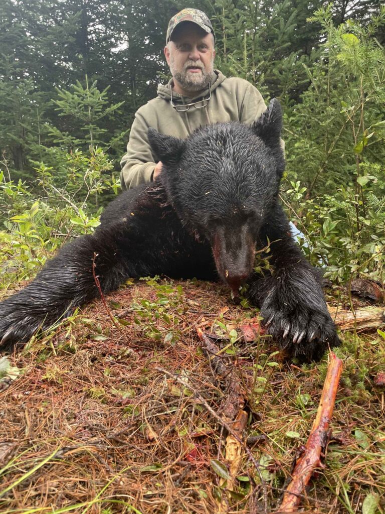 Northeast Wilderness Outfitters specializes in Maine black bear hunting. Our bear hunts are with the use of bait. We only take a limited number of hunters per week. Our stands are set up to accommodate you with whatever weapon you choose to hunt. We have tree stands or ground blinds set up for you to hunt from, or you may bring your own. We plan on at least 2 bait sites per hunter and we utilize trail cameras on the bait sites prior to your arrival to determine what sites are the most active. Bear sizes average 150 lbs, although we have shot many over 300 lbs. Meals, lodging, transportation to and from your bait site and skinning and quartering of your bear is included in the price of the hunt. There are no hidden fees.
